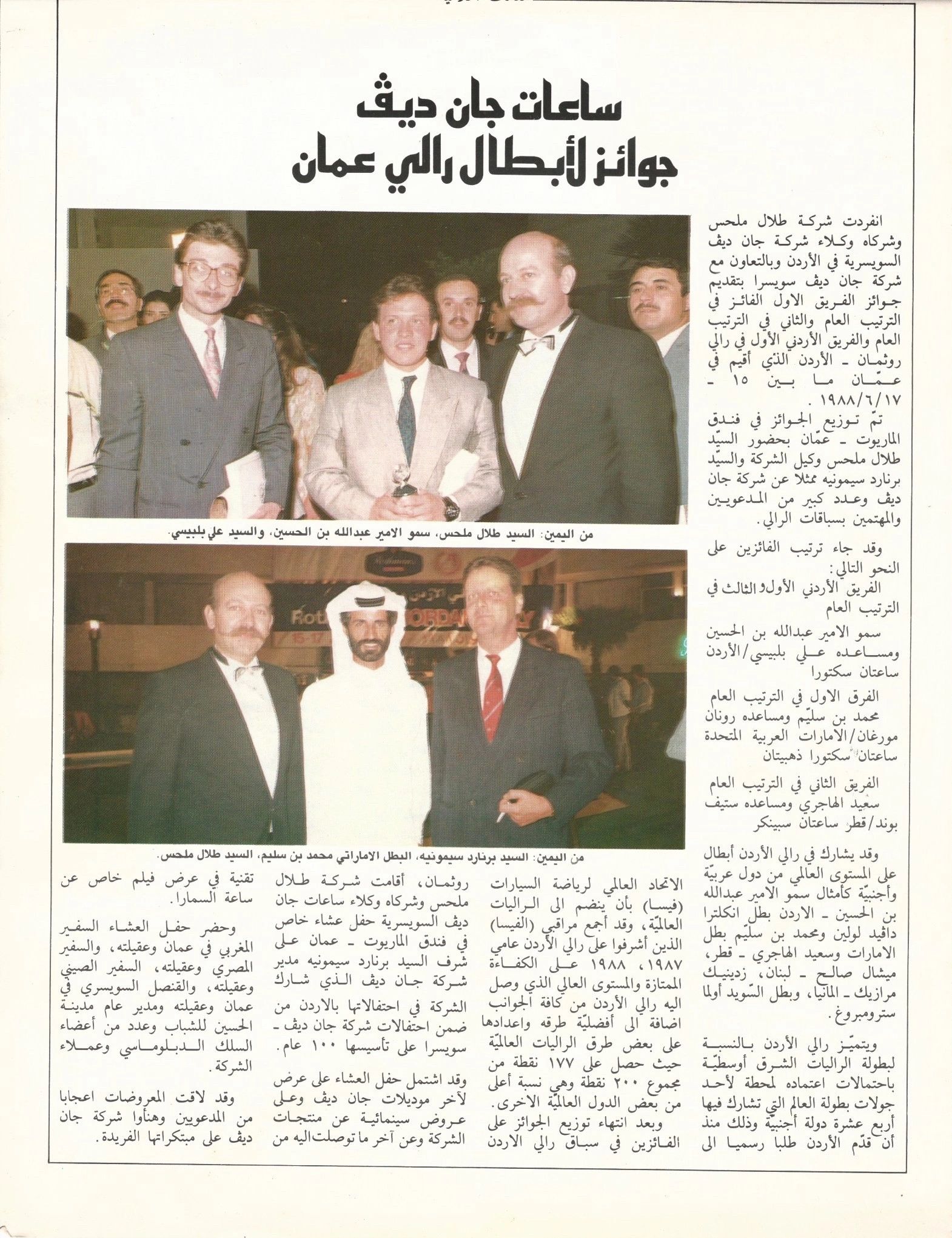 Talal Malhas & Co. sponsored the Jordan Rally of 1988, and provided all the awards for the winners and participants. The selection of awards were fine jewellery watches from Jean D'Eve.